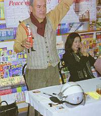 開会予定の1時近くになり、黒部さんも到着され「待たせるのも悪いしねぇ〜」ということでフライングスタートとなりました。最初のファンは著書のサインの他に、科学特捜隊・ウルトラ警備隊ヘルメットを持参してサインを頼んでいましたが、数量限定で販売されたものだそうで結構高いモノらしい、という話をひし美さんが黒部さんにされて、黒部さんは「僕なんかが書いていいの?」と聞かれていました。もちろんサインは快くして下さり、「テーブルに飾らしてくれないかな?」と逆に持ってきたファンに頼んでおられました。