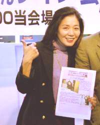 (写真右)ツーショットに応じて下さるひし美さん。手には前日開催された大阪でのサイン会のホームページ報告のプリントを持って参加者に告知しています。「昨日のサイン会の報告がホームページにもう上がっていま〜す。見て下さいね〜。」